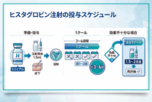 ヒスタグロビン注射1バイアルを注射用水1.5mLに溶解し皮下に注射します。通常1回1バイアルを、成人では週1~2回で計3~6週間を行います。これを1クールとするので、3~6週間の間に3~6回投与します。 十分な効果のあらわれない場合には、更に1クールの注射を行います。この場合は1回投与量を増量しての投与が可能ですので、症状をみながら2バイアルへの増量を検討します。 これがヒスタグロビンの投与方法になります。効果が認められたら、維持療法として注射を行っていきます。ヒスタグロビン維持療法は、初期の治療で得られたアレルギー反応抑制効果を維持するため、治療終了後3~4ヶ月に1回の頻度で追加注射を続ける方法で、花粉症や通年性アレルギーの症状を長期的にコントロールすることを目指します。