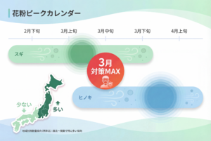 スギ花粉のピークは早い地域で2月下旬から始まり、広い範囲では3月上旬~中旬にピークを迎える見込みと言われておりますので、外来では、1月後半から2月頭から投与を開始される方が多いです。花粉の時期は2か月程度続きますし、ヒノキの花粉症の方も多いですので、花粉症の症状が出始めてから開始する方も実際は多くいらっしゃいいます。