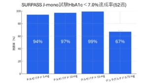 糖尿病薬を中断していたもしくは未治療の日本人2型糖尿病患者を対象としたSURPASS-J-monoではチルゼパチド投与とデュラグルチド(トルリシティ)投与を比較検討しており、糖尿病治療で目標とするHbA1c7.0以下の達成率がトルリシティでは67%だったのに対して、マンジャロの単独投与のみで、HbA1c 7.0%未満の治療目標を達成した割合が94%以上という、素晴らしい血糖低下効果を示しました。