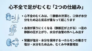 心不全のむくみは、①静脈の渋滞と、②体が水分をため込む反応が重なって起こります。