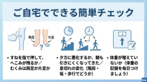 • ・むくみが急に強くなり、数日〜1週間で体重が増えた(目安として1週間で2〜3kg増えるようなときは要注意です)